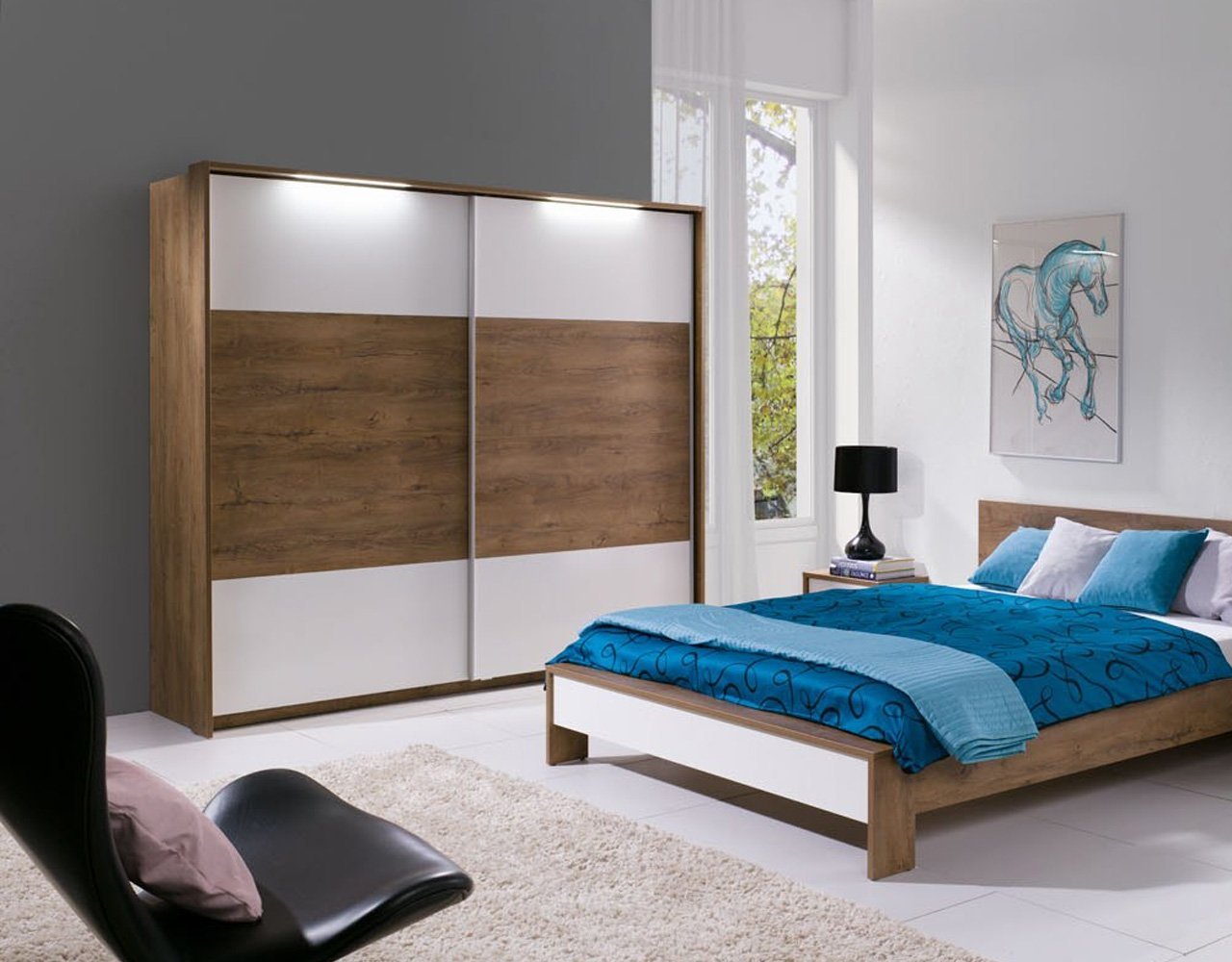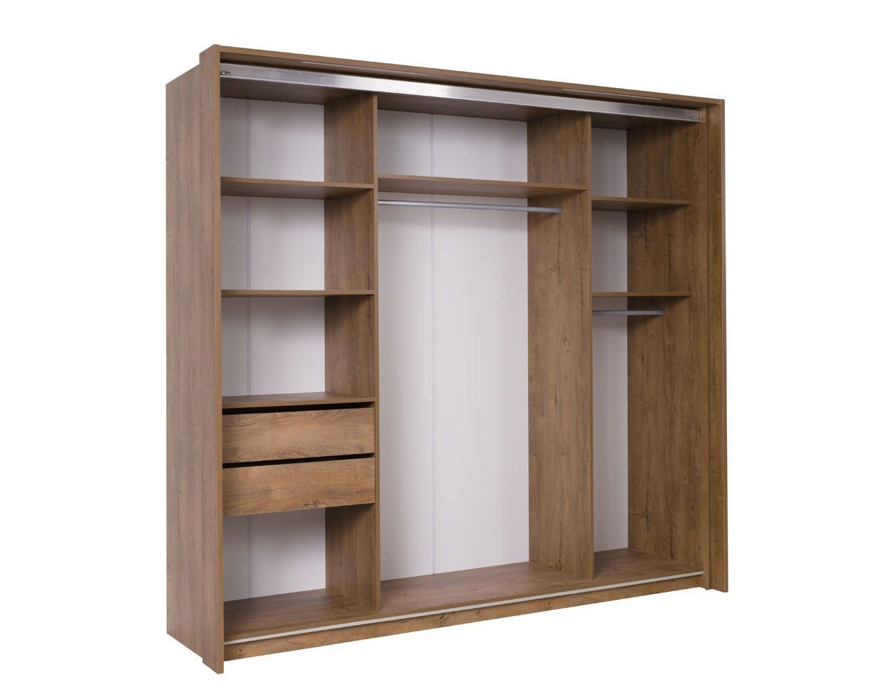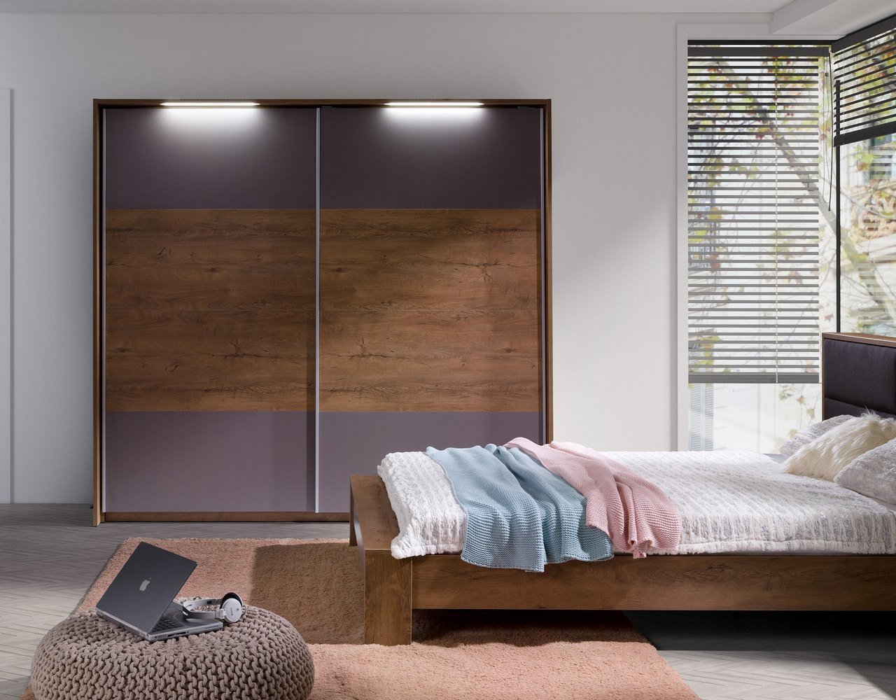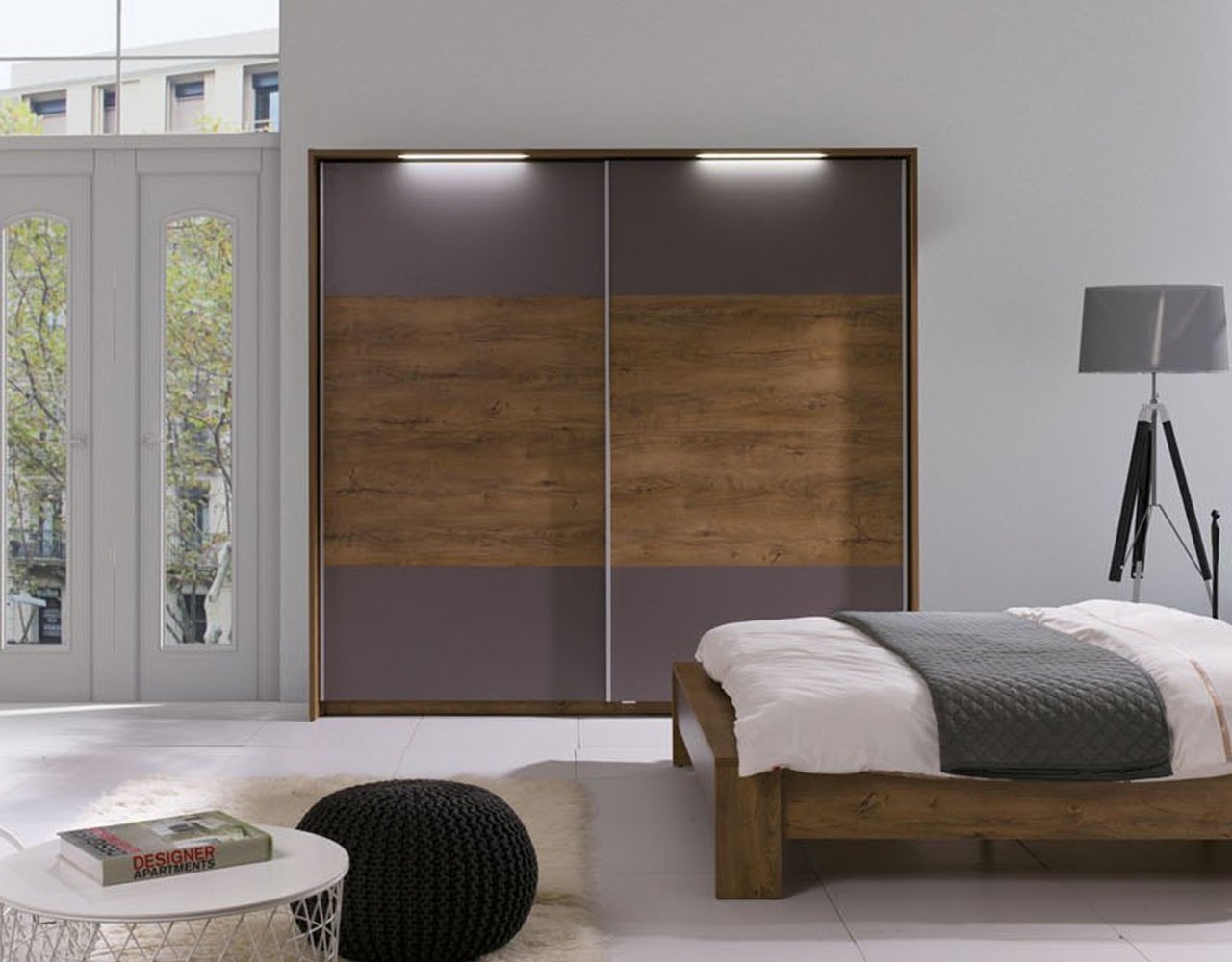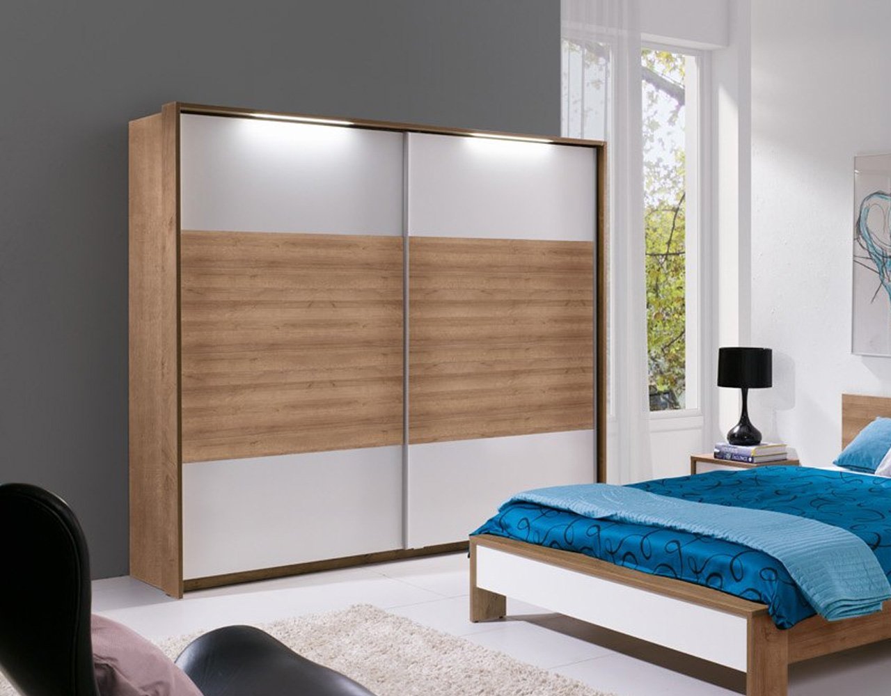 Dwudrzwiowa szafa przesuwna z praktycznym oświetleniem led, pojemnymi półkami, 2 szufladami i 2 drążkami.