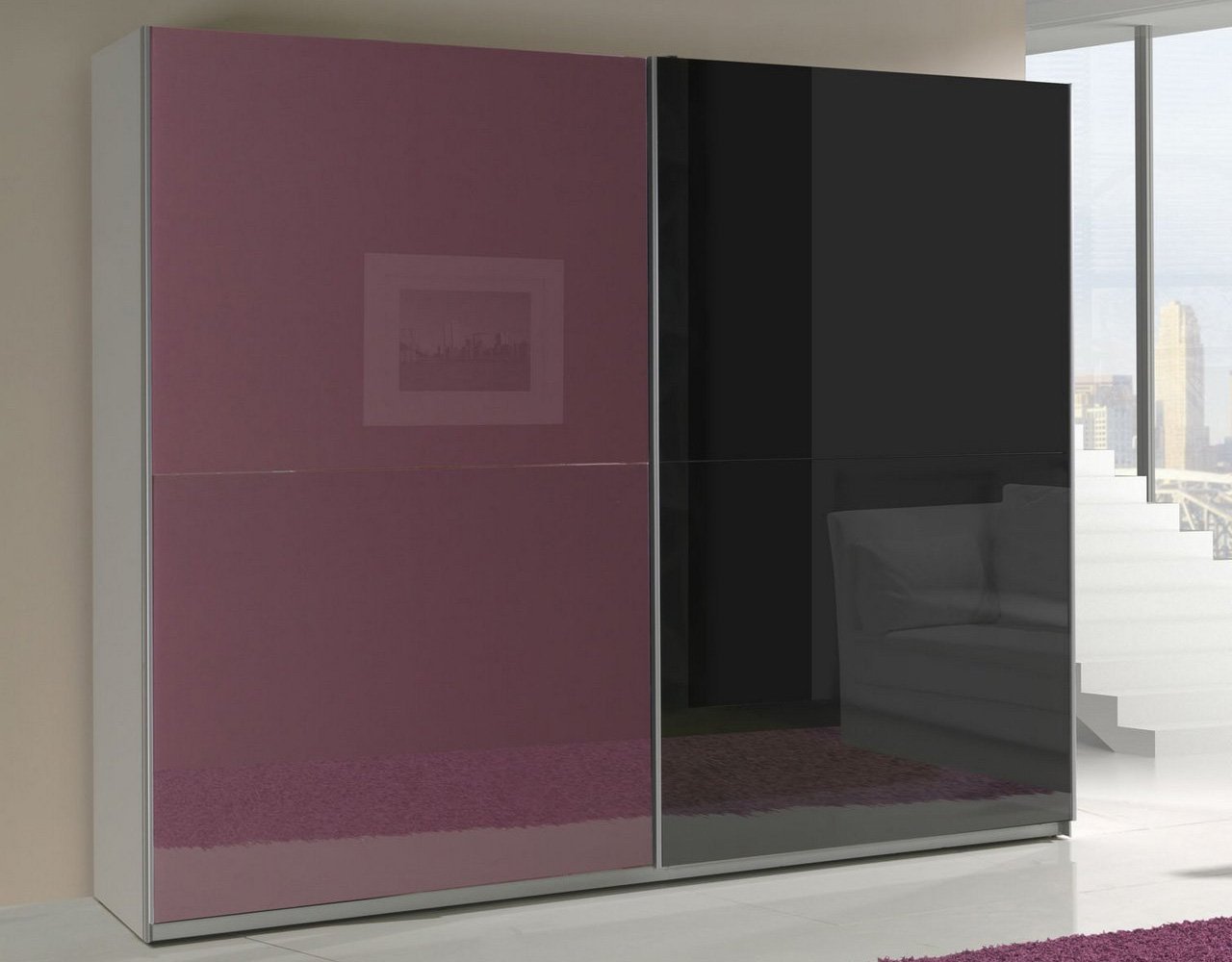 Nowoczesne szafy przesuwne - LORENZO 244cm z fioletowym lacobel. Pojemna szafa przesuwna z czarnym i fioletowym frontem