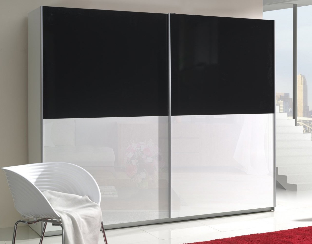 Szafa przesuwna, dwudrzwiowa, z z frontami w połysku (lacobel) w 2 kolorach. Korpus biały, 244cm, drążek i półki.