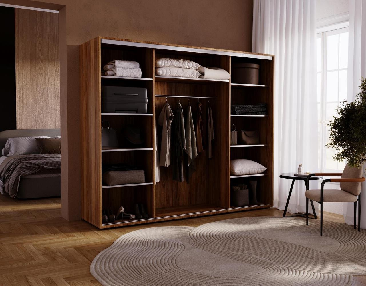 Szukasz połączenia elegancji, praktyczności i trwałości? Szafa przesuwna z lustrem SANTO to idealne rozwiązanie dla osób, które cenią sobie nowoczesny design i perfekcyjną organizację przestrzeni. Dzięki szerokości 255 cm, model SANTO należy do kategorii dużych szaf przesuwnych, które gwarantują sporą ilość miejsca do przechowywania. Centralne lustro na froncie nie tylko dodaje elegancji, ale także optycznie powiększa pomieszczenie, doświetlając je naturalnym światłem. Przestronne półki i przegrody doskonale nadają się do przechowywania złożonej odzieży, pościeli czy sezonowych dodatków, a drążki na ubrania umożliwiają wygodne rozmieszczenie rzeczy wymagających powieszenia, takich jak płaszcze, sukienki czy garnitury. Szafa przesuwna z lustrem sprawdzi się zarówno w minimalistycznych wnętrzach, jak i w przestrzeniach o bardziej klasycznym lub industrialnym charakterze.
