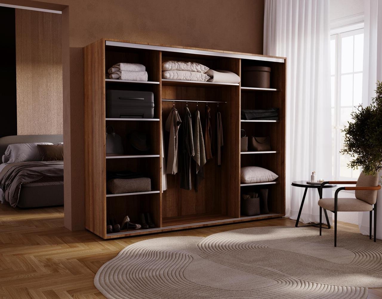 Szukasz połączenia elegancji, praktyczności i trwałości? Szafa przesuwna z lustrem SANTO to idealne rozwiązanie dla osób, które cenią sobie nowoczesny design i perfekcyjną organizację przestrzeni. Dzięki szerokości 255 cm, model SANTO należy do kategorii dużych szaf przesuwnych, które gwarantują sporą ilość miejsca do przechowywania. Centralne lustro na froncie nie tylko dodaje elegancji, ale także optycznie powiększa pomieszczenie, doświetlając je naturalnym światłem. Przestronne półki i przegrody doskonale nadają się do przechowywania złożonej odzieży, pościeli czy sezonowych dodatków, a drążki na ubrania umożliwiają wygodne rozmieszczenie rzeczy wymagających powieszenia, takich jak płaszcze, sukienki czy garnitury. Szafa przesuwna z lustrem sprawdzi się zarówno w minimalistycznych wnętrzach, jak i w przestrzeniach o bardziej klasycznym lub industrialnym charakterze.
