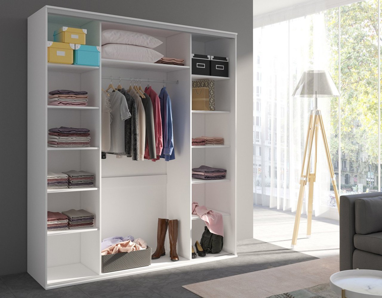 Szafa przesuwna, dwudrzwiowa z drążkiem i wieloma półkami. 5 kolorów, 204cm z lustrami.