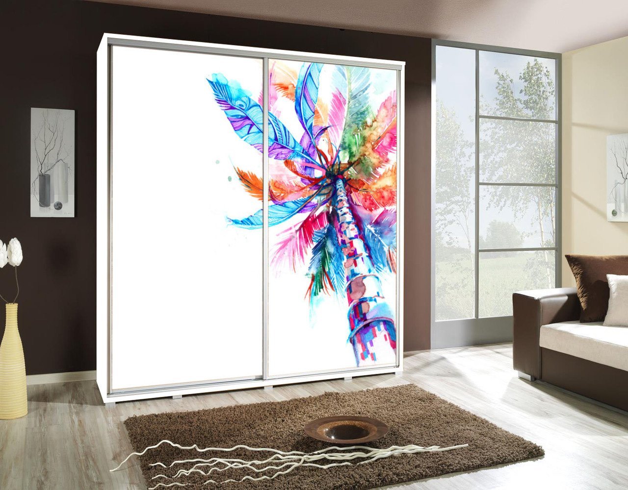 Szafa z grafiką, nadrukiem dwudrzwiowa 205cm - PALMA 1 - kolorowe drzewo na białym tle.